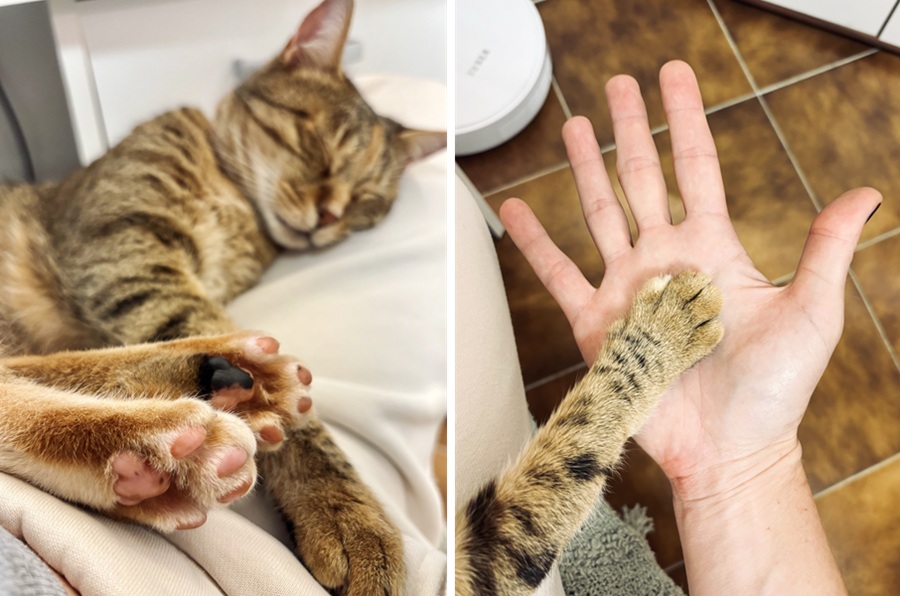 Otevřu dveře, odchytnu Daisynku, posadím si ji na klín a opřu si ji zády o sebe. V jedné ruce mám čistič, druhou postupně chytám packy a jemně je čistím. U každé pacinky vytlačím trošku pěny a jdeme na to. Daisy na svoje poměry překvapivě drží – a dokonce pacinku sama od sebe roztáhne, takže se dostanu kartáčkem úplně všude. Naprosto nechápu. Kočka, která dostává hysterák při kontrole uší, je při čištění packy úplně v pohodě. A chvílemi vypadá, že si to dokonce užívá!