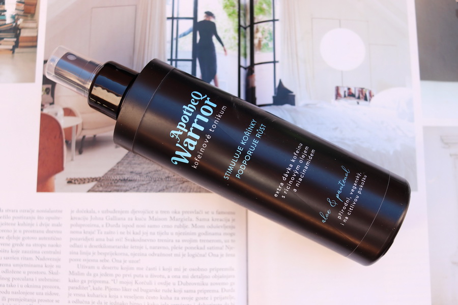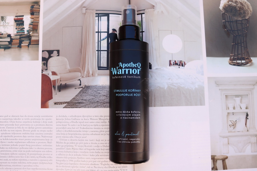 Ihned po mytí a vysušení vlasů (když nespěchám, snažím se vyhýbat i fénu) nanáším do konečků olejíček a na pokožku sérum proti padání vlasů od L’Occitane (to zelené). Ráno pak používám Warrior kofeinové tonikum ve spreji od ApotheQ z řady od Soaphoria.