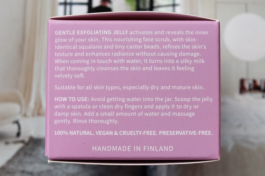 Složení peelingu je vyloženě komfortní. Squalan a makadamiový olej pečují o hydrataci i elasticitu, zatímco olej ze semen Meadowfoam uzamkne vlhkost tam, kde je potřeba. Celé složení je bez parfemace, bez konzervantů a bez dráždivých látek. To ocení všichni, kdo mají citlivou pleť, která reaguje spíš na vůně než na samotné peelingové částice. To je mimochodem i důvod, proč ho švédské i finské recenze označují jako peeling, který „stojí za to i pro citlivky“.